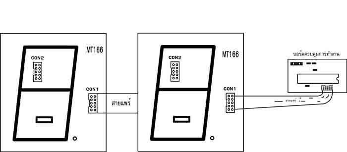 ใช้สายแพร์ต่อจากบอร์ดควบคุมเข้าที่CON1ของ MT166ถ้าต้องการใช้บอร์ดMT166ต่ออนุกรมกันเรื่อยๆให้ต่อที่จุดCON2 ของบอร์ดที่1เข้าCON1ของMT166บอร์ดที่2ต่ออนุกรมกันไปเรื่อยๆ ดังรูป