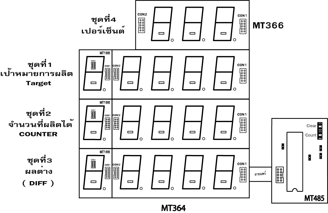 >> สามารถต่ออันดับกันได้เพื่อเพิ่มจำนวนหลัก เช่น ที่ใช้ร่วมกับชุดแสดงเป้าหมายการผลิต 5 หลัก(MT485) ใช้ MT364 จำนวน 4 หลัก 3 ชุดและใช้ MT166 อีก 1 หลัก 3 ชุด จะได้ตัวเลข 5 หลัก 3 ชุด และใช้ MT366 ตัวเลข 3 หลัก 6นิ้ว 1 ชุด รวมเป็นตัวเลข 18 หลัก